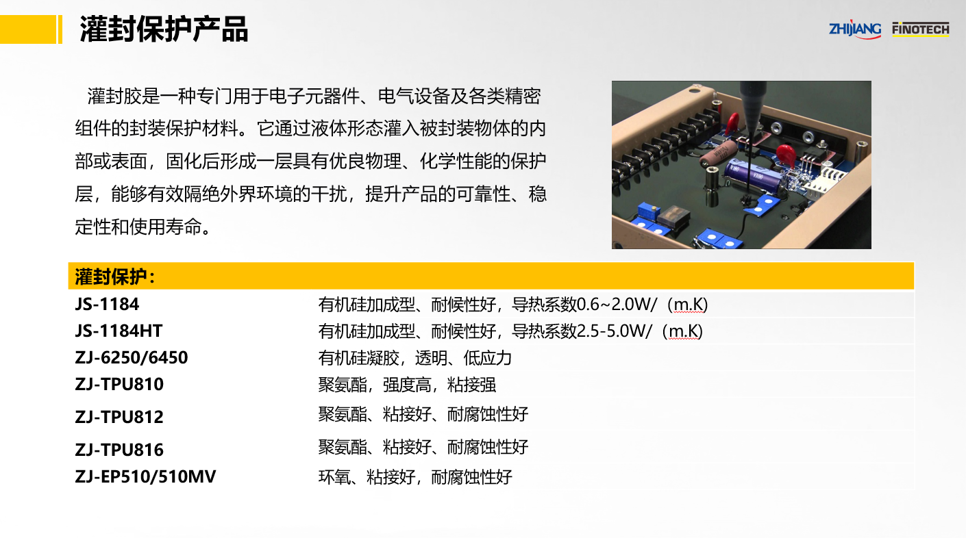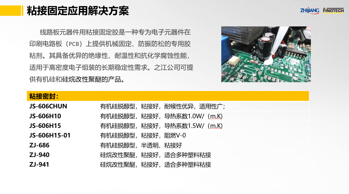 之江公司立足于中國膠粘劑行業領軍企業和有機硅、聚氨酯、環氧等專業膠粘劑的創新和產業化優勢,具有國家高新技術企業和國家級企業技術中心資質,依靠國家級CNAS實驗室以及國家級博士后科研工作站,并有國際專家助力,為PCB印刷線路板的三防涂敷、粘接固定、導熱灌封等提供系統用膠解決方案。其中,關鍵產品如下:
