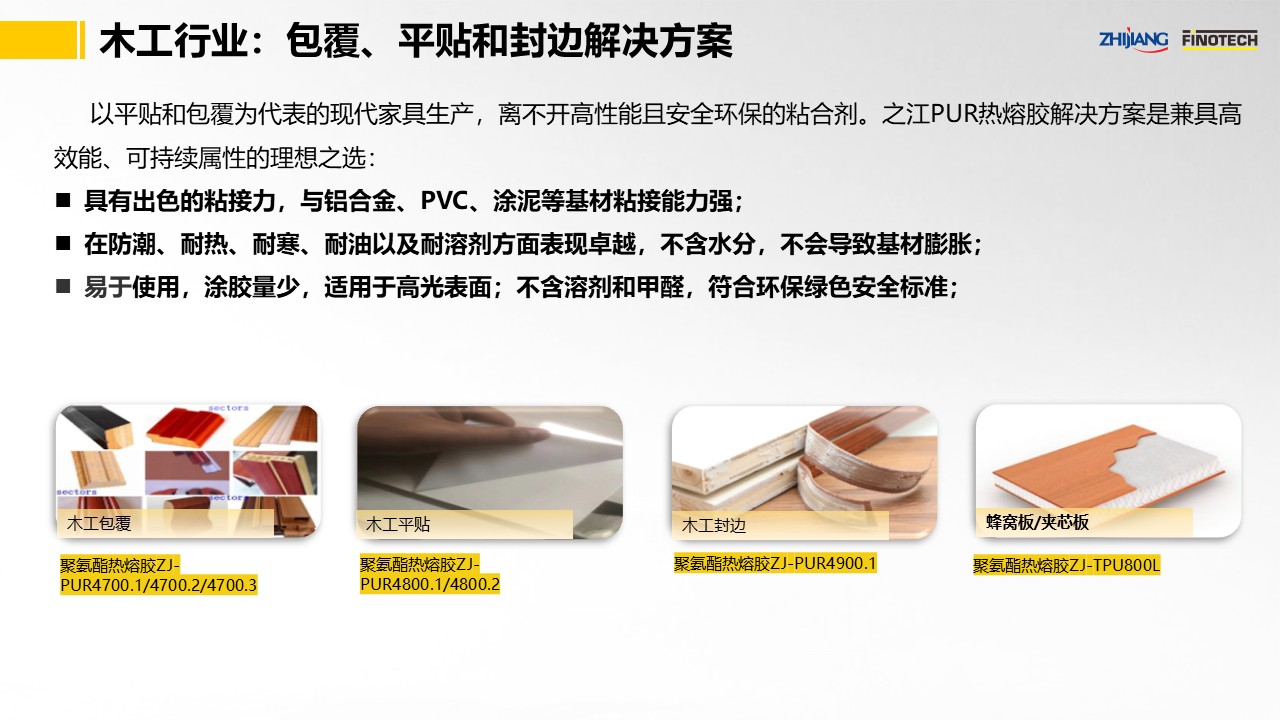 之江公司立足于中國膠粘劑行業(yè)領(lǐng)軍企業(yè)和有機硅膠、聚氨酯、環(huán)氧等專業(yè)膠粘劑的創(chuàng)新和產(chǎn)業(yè)化優(yōu)勢,具有國家高新技術(shù)企業(yè)和國家級企業(yè)技術(shù)中心資質(zhì),依靠國家級CNAS實驗室以及國家級博士后科研工作站,并有國際專家助力,可為木工行業(yè)提供包覆、平貼、封邊應用的聚氨酯熱熔膠粘接解決方案,推出了如下產(chǎn)品: