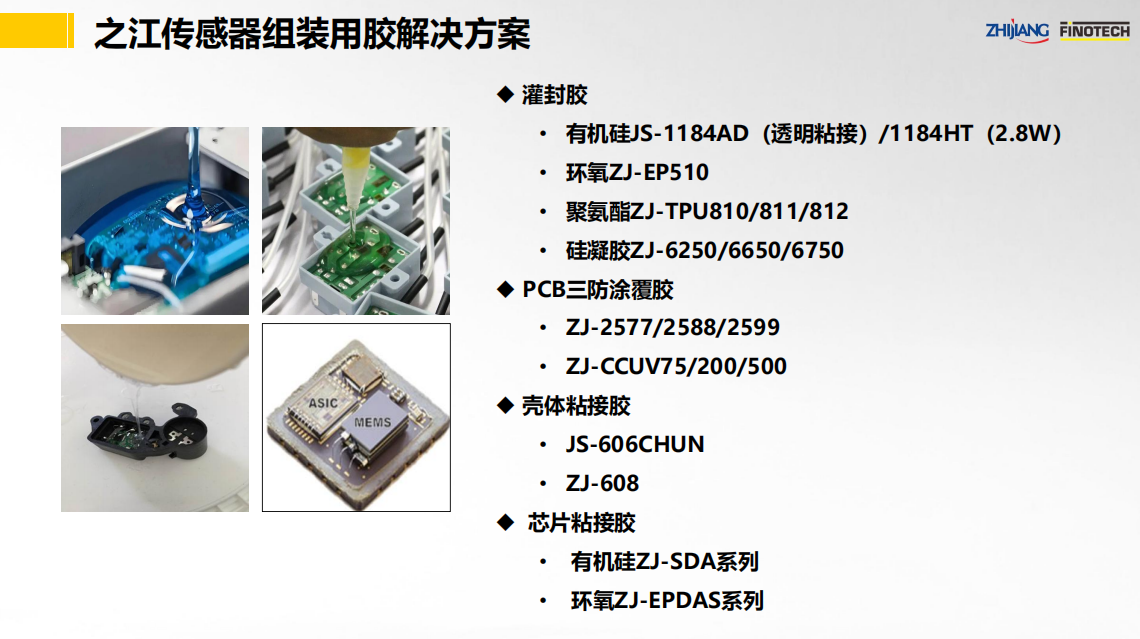 之江公司立足于中國膠粘劑行業領軍企業和有機硅、聚氨酯、環氧等專業膠粘劑的產業化優勢,具有國家級高新技術企業和國家級企業技術中心資質,依靠國家級CNAS實驗室以及國家級博士后科研工作站,并有國際專家助力,為傳感器行業提供高性能的粘接密封解決方案。其中,關鍵產品如下: